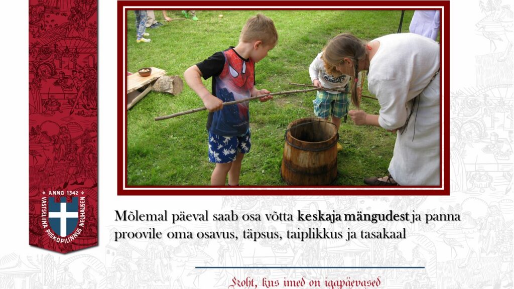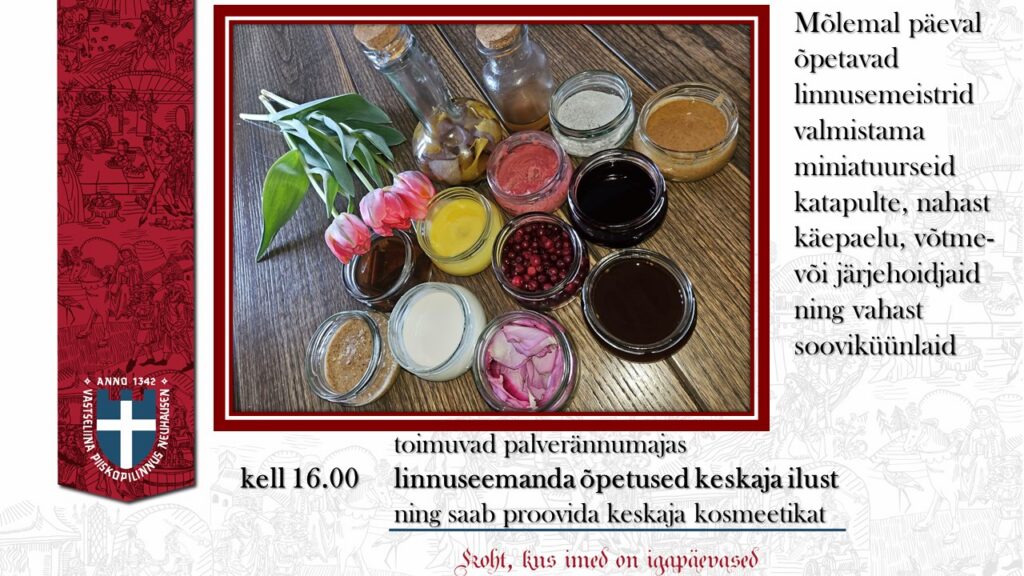 Keskaja õpi- ja töötubades saate uusi kogemusi, mis rikastavad valitud elamusprogrammi või elamuspaketti. Õpi- ja töötoad toimuvad ettetellimisel ning madalhooajal.